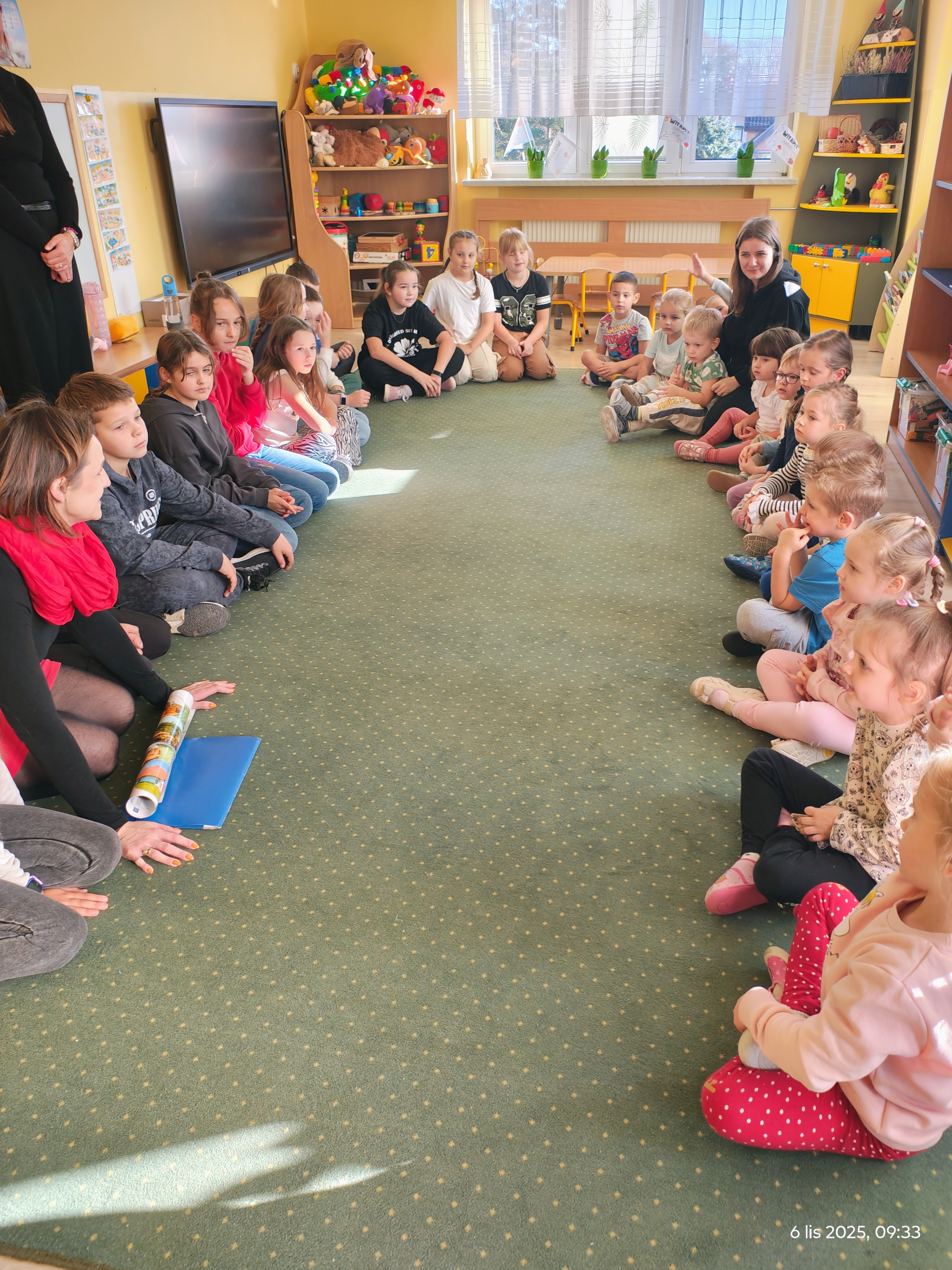 W dniu 6.11.2025, nasze przedszkole odwiedzili uczniowie ze Szkoły Podstawowej nr 2 w Tarnowie, w ramach akcji "Odblaskowa Szkoła 2025". Celem tej wizyty było poszerzenie wiedzy o zasadach bezpieczeństwa ruchu drogowego, popularyzacja stosowania przez uczestników ruchu drogowego elementów odblaskowych i wyposażenie jak największej liczby dzieci oraz dorosłych w odblaski.