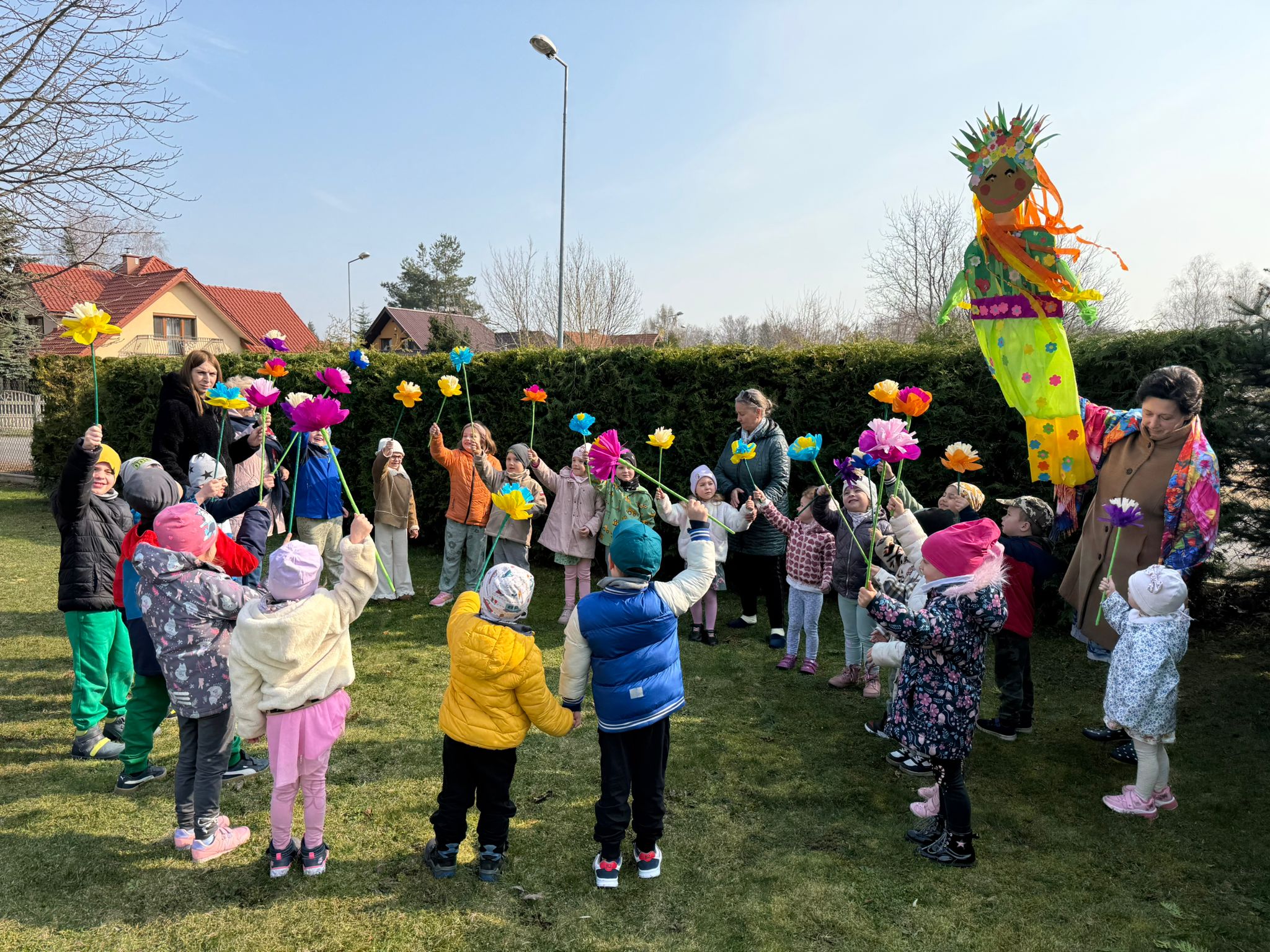 20 marca w naszym przedszkolu zapanowała radosna, zielona atmosfera. Dzieci pożegnały zimę niosąc kukłę Marzannę, a powitały wiosnę kolorowymi kwiatami, piosenkami i tanecznym korowodem. Tego dnia nie zabrakło szukania pierwszych zwiastunów wiosny oraz wspólnych zabaw przy muzyce. Mamy nadzieję, że dzięki zaangażowaniu przedszkolaków, zima szybko do nas nie wróci. Widzieliśmy jak wsiadła do pociągu i odjechała na Biegun Północny.