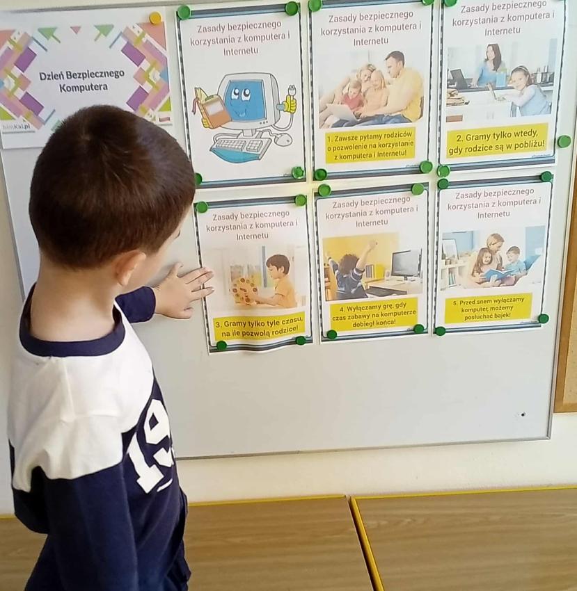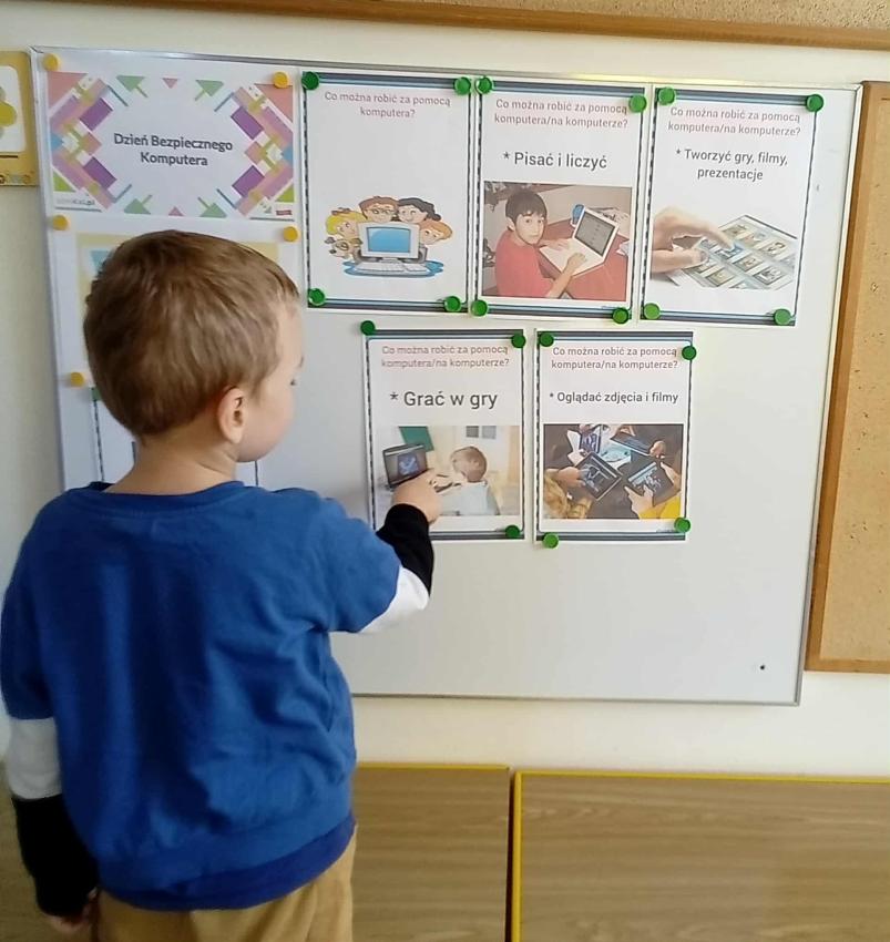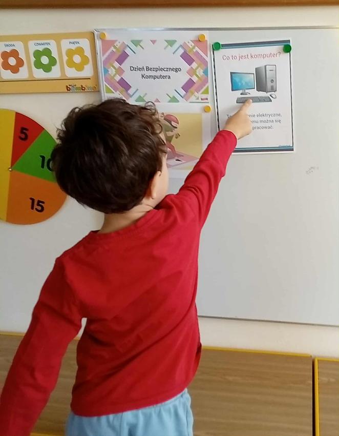 Dzień Bezpiecznego Komputera w grupie Odkrywcy. W tym dniu rozmawialiśmy o możliwościach i zagrożeniach związanych z korzystaniem z komputera. Kluczowym elementem było ustalenie zasad bezpiecznego korzystania z komputera i internetu.